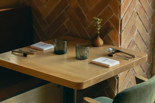 Les luminaires attirent immédiatement le regard : singuliers, chaleureux, parfaitement adaptés à l’atmosphère intime que Pedro a voulu créer. Chaque élément, des céramiques aux verres, témoigne d’une vision collective élaborée avec son équipe, matérialisant un concept qui célèbre le savoir-faire traditionnel portugais.