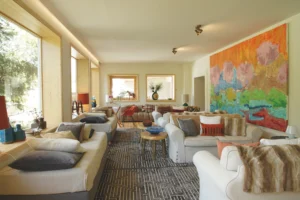 Quatre piscines ponctuent le domaine : un grand bassin extérieur entouré d’herbes sauvages, un bassin peu profond pour les enfants, des piscines semi-privées dans certaines zones et une piscine intérieure chauffée installée dans un bâtiment ressemblant à une grange. En hiver, la cheminée invite à la lecture. En été, on navigue entre piscine et océan.
